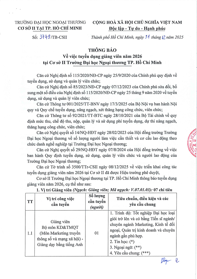 Cơ sở II Trường Đại học Ngoại thương tại TP. Hồ Chí Minh thông báo tuyển dụng giảng viên năm 2026, cụ thể như sau: