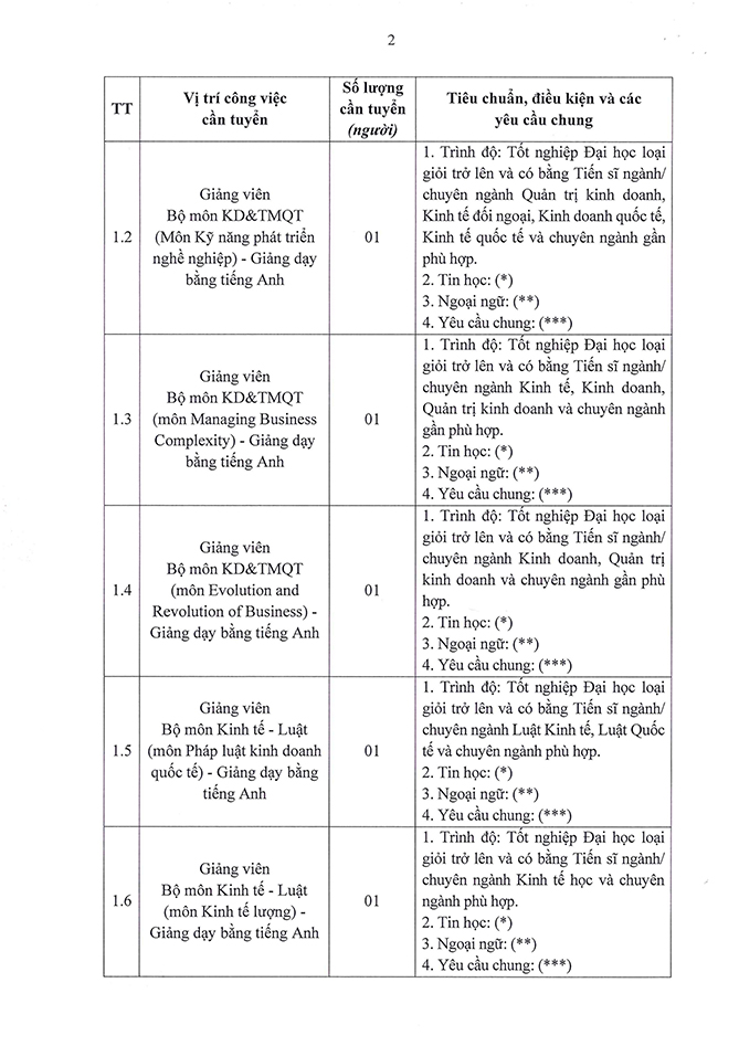 1. Trình độ: Tốt nghiệp Đại học loại giỏi trở lên và có bằng Tiến sĩ ngành/ chuyên ngành Quản trị kinh doanh, Kinh tế đối ngoại, Kinh doanh quốc tế, Kinh tế quốc tế và chuyên ngành gần phù hợp. 2. Tin học: (*) 3. Ngoại ngữ: (**) 4. Yêu cầu chung: (***) |