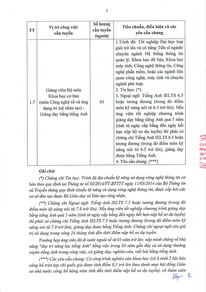 (**) Chứng chỉ Ngoại ngữ: Tiếng Anh IELTS 7.5 hoặc tương đương (trong đó điểm môn kỹ năng nói từ 7.0 trở lên). Nếu ứng viên tốt nghiệp chương trình giảng dạy bằng tiếng Anh quá 5 năm (tính từ ngày cấp bằng đến ngày hết hạn nộp hồ sơ dự tuyển) thì phải có chứng chỉ Tiếng Anh IELTS 7.5 hoặc tương đương (trong đó điểm môn kỹ năng nói từ 7.0 trở lên), giảng dạy được bằng Tiếng Anh. Chứng chỉ ngoại ngữ còn giá trị sử dụng trong vòng 24 tháng tính đến thời điểm nộp hồ sơ dự tuyển.