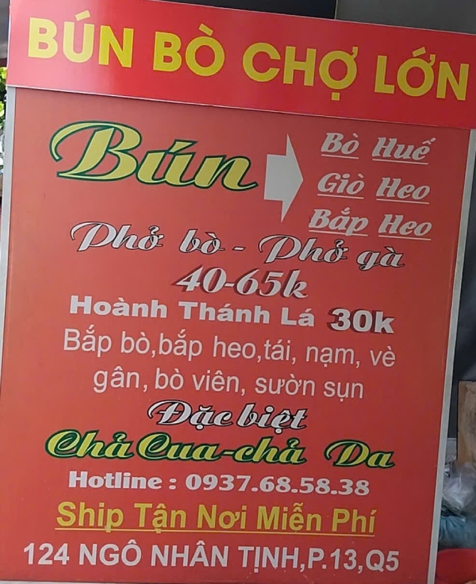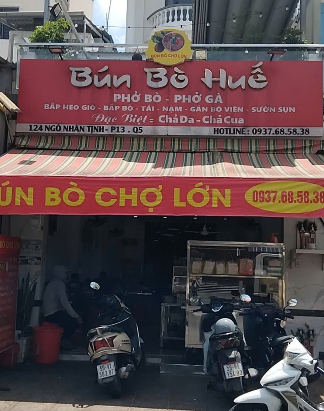 Nằm tại địa chỉ 124 Ngô Nhân Tịnh, P13, Quận 5, Bún Bò Chợ Lớn là một quán ăn quen thuộc với nhiều người dân khu vực và khách vãng lai. Không cần biển hiệu cầu kỳ, quán vẫn luôn thu hút bởi hương thơm lan tỏa của nồi nước lèo nghi ngút và vị đậm đà trong từng tô bún.